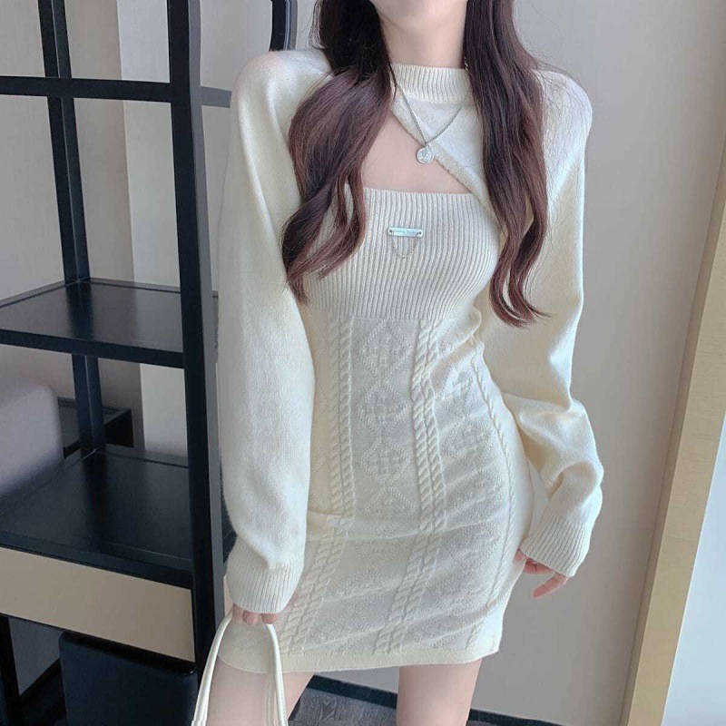 起爆金秋冬純欲ニットワンピースのストラップが痩せているスリムワンピースのデザイン感長袖ニットスカートセット