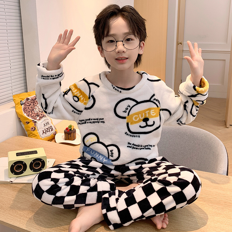 子供のサンゴの毛の冬のパジャマの男の子の厚いフランネルのベルベットの男の子の保温の中で大きい子供の家の服のスーツ