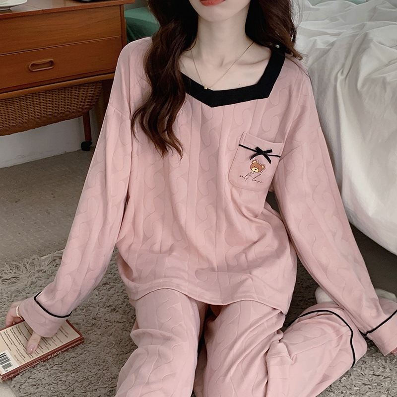 パジャマの女性の春と秋の韓国系ins風の甘いかわいい蝶結びのハスの葉の辺の長袖のズボンの少女の家の服