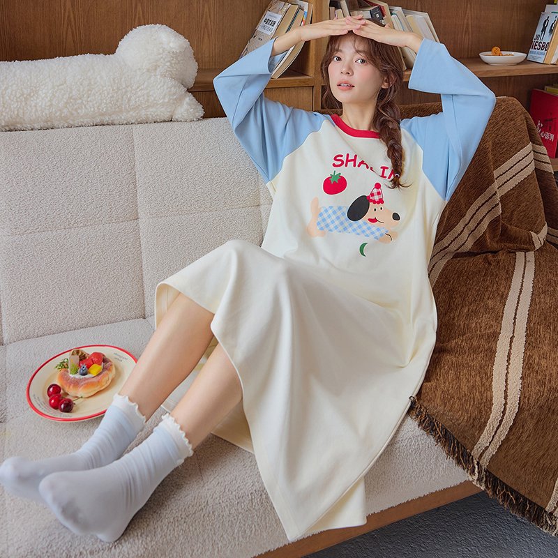 純綿のレース付きナイトガウン 女性用 2025年春秋 長袖 胸パッド付き 可愛い漫画猫柄 パジャマ 女性用ルームウェア