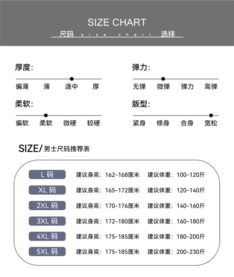サイズ L(100-120斤),Xl (120-140斤),2xl (140-160斤),3xl (160-180斤),4xl (180-200斤),5xl (200-230斤)