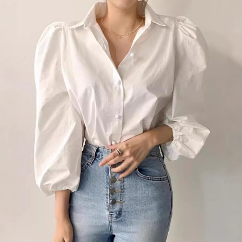 韓国の早春新作、フレンチスタイルの個性的なシンプル無地ゆったり万能シングルボタンラペルパフスリーブシャツ
