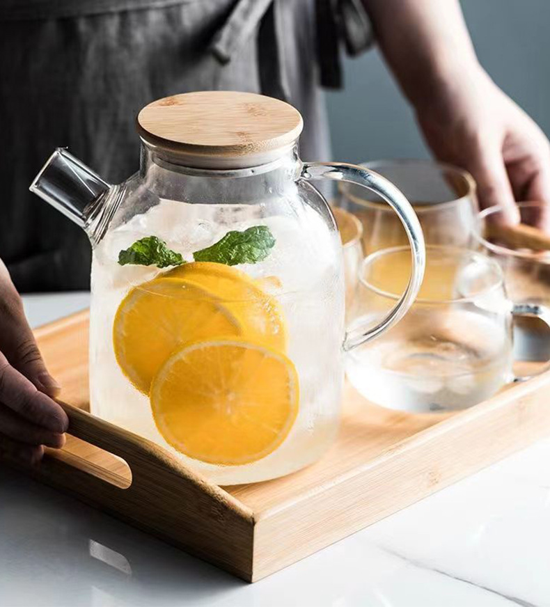 メーカーは大容量の厚いガラス製コールドケトル、耐熱ガラス製コールドケトル、ジュースケトル、クールな白い竹蓋ケトルを供給しています。
