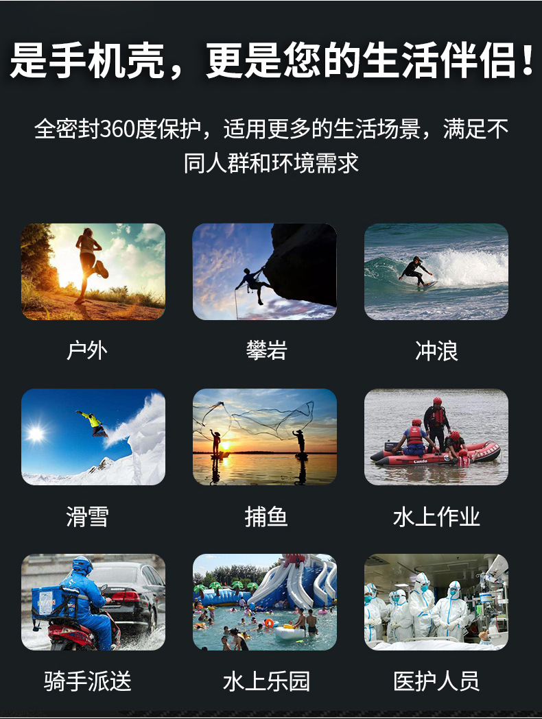 2:质量保证产品特点:拥有四防防护:防水,防摔,防压,防尘防水:潜水级别,防护水深达到2米,防水时间达到30分钟以内:三重防护,钢化玻璃,金属外壳,内层硅胶防压:锌合金材质拥有高质量的防压抗性防尘:拥有全密封的性能,让你手机一尘不染。