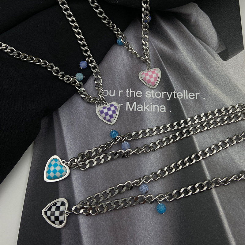 韓国式の新型棋盤格愛ペンダント中性風シンプルinsネックレス女性デザイン感ヒップホップセーターチェーンブーム