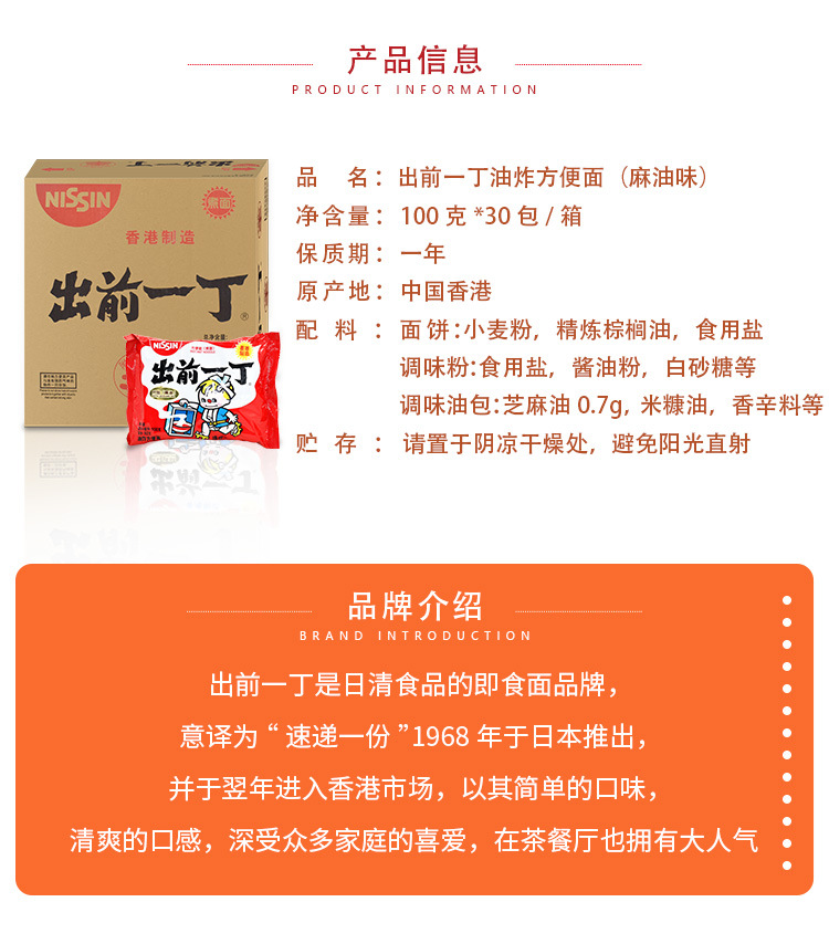 香港輸入食品日清前一丁麻油味インスタントラーメン100g * 30袋入りインスタントラーメン