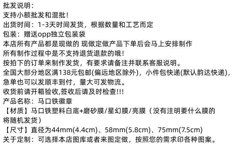 サイズ 44mmバッジ,58mmバッジ,58mm デイバレー 鉄底バッジ,75mmバッジ,75mm円形ミラー