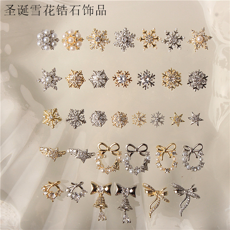 网红爆款珍珠雪花球美甲锆石饰品钻秋冬圣诞节雪花星星指甲穿戴甲