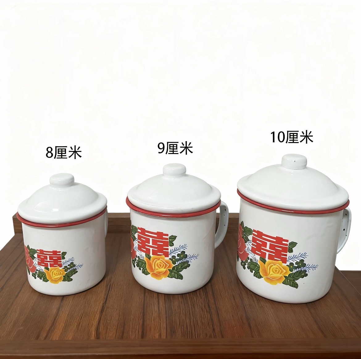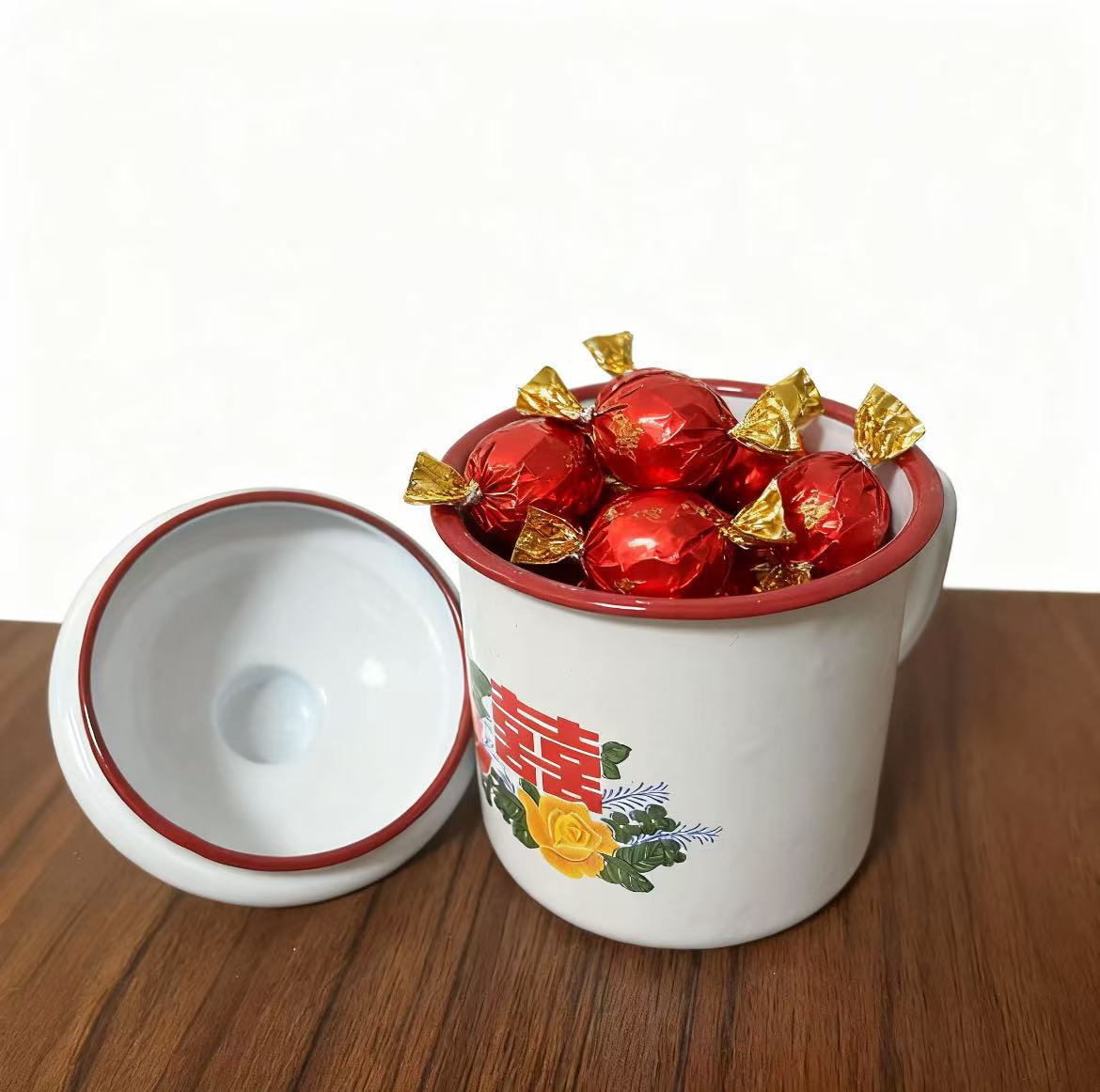 懐かしい昔ながらの花柄レッドダブルハピネスエナメルカップ結婚式のお土産ウェディングキャンディーエナメルカップ蓋付き大容量マグカップ