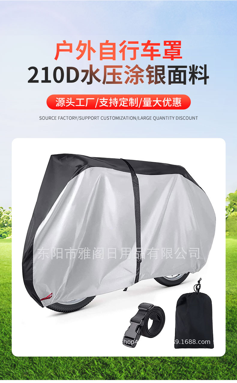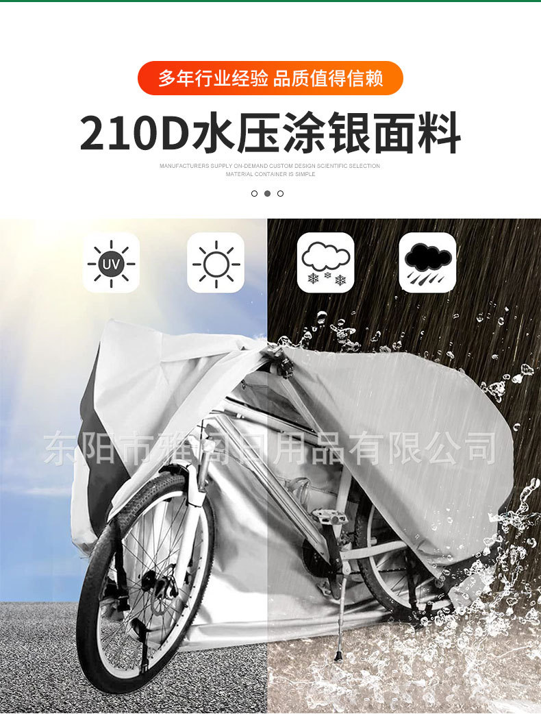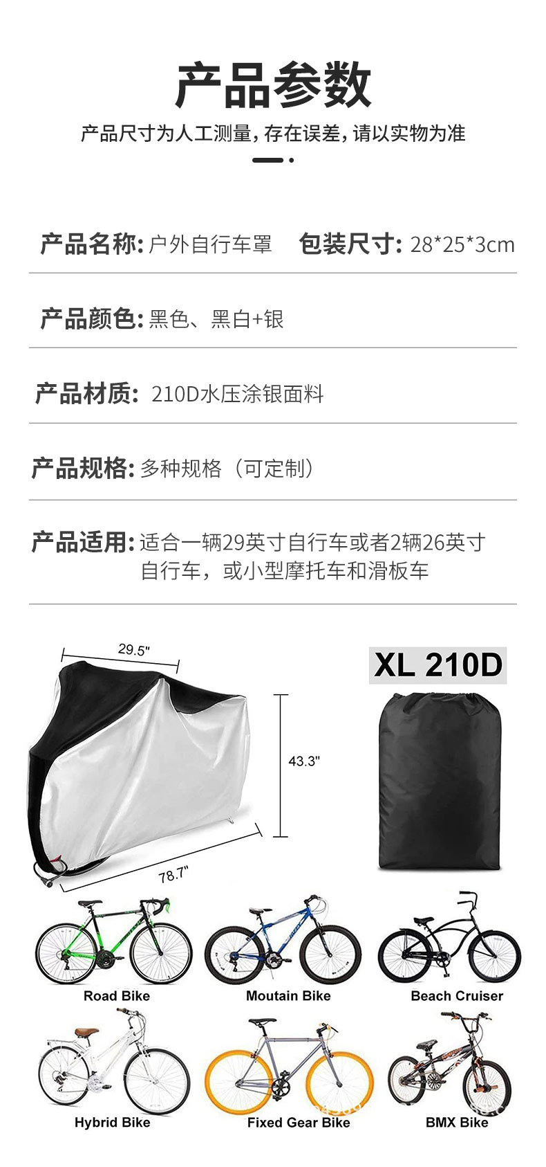 材料使用: 户外自行车罩防水罩采用210D水压2000MM涂银面料,可保护自行车免受灰尘、污垢、阳光、雨水、紫外线和污染。 让您的自行车长时间如新。适合大多数自行车。