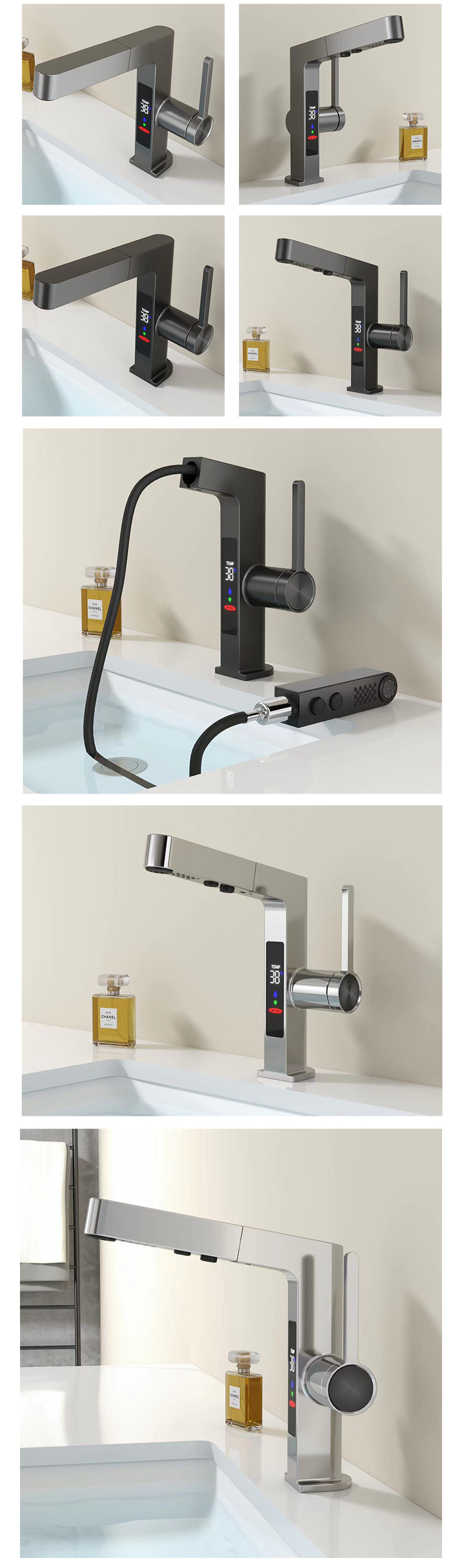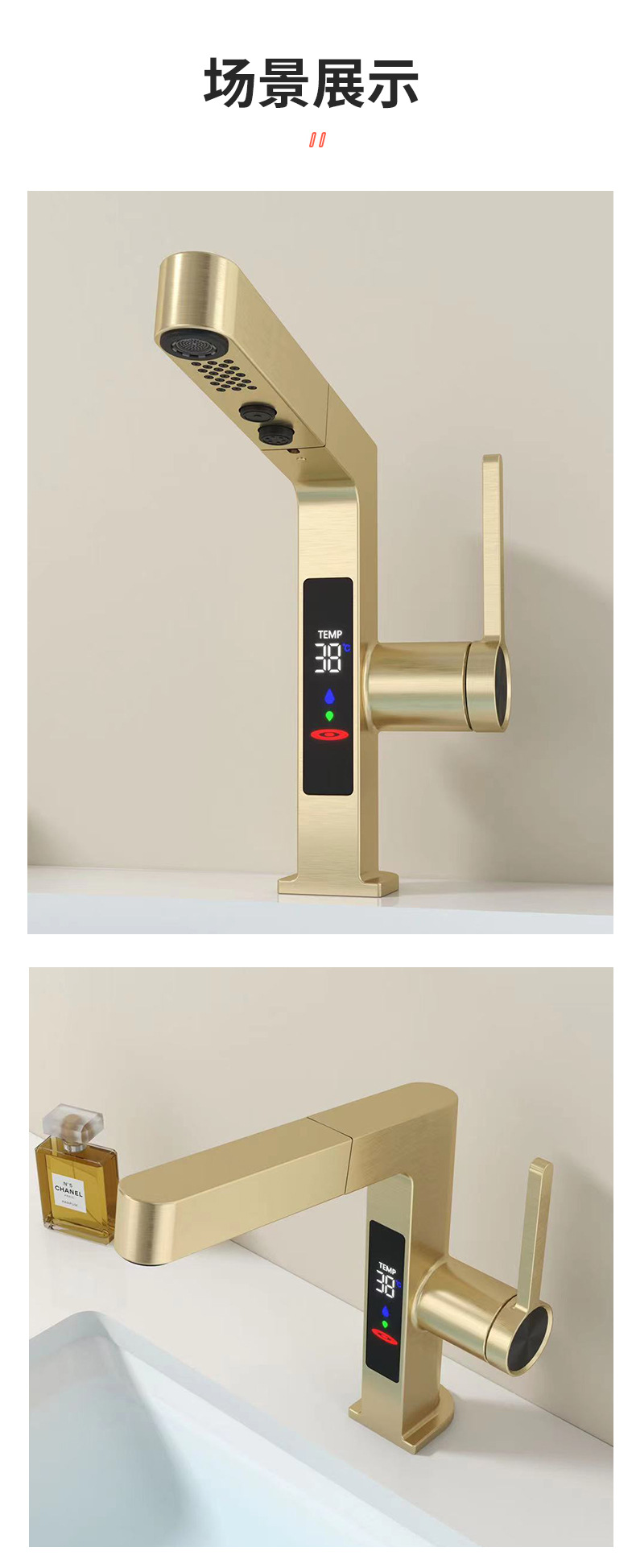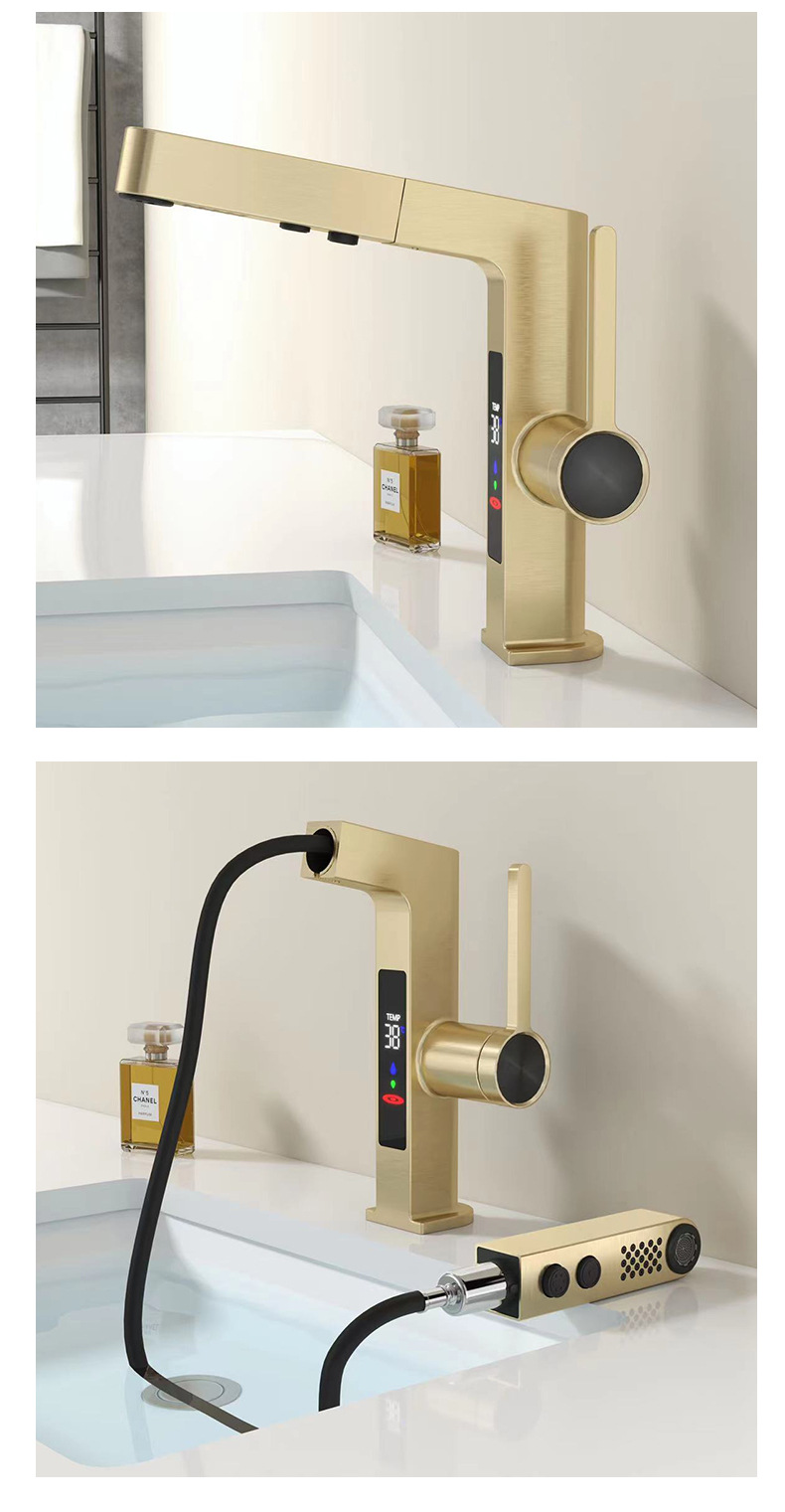 スマートな新型引き出し式蛇口、デジタルディスプレイ付き、ダブルヘッド吐水、亜鉛メッキ銅製、セラミックコア、メーカー在庫卸売