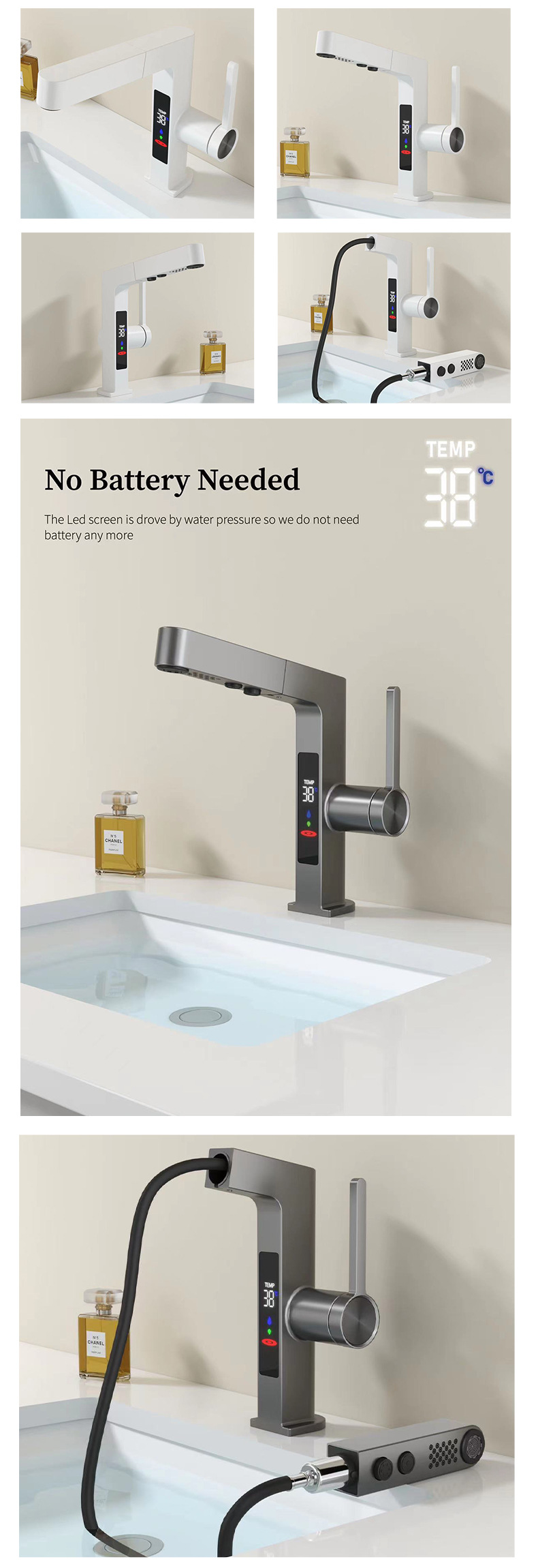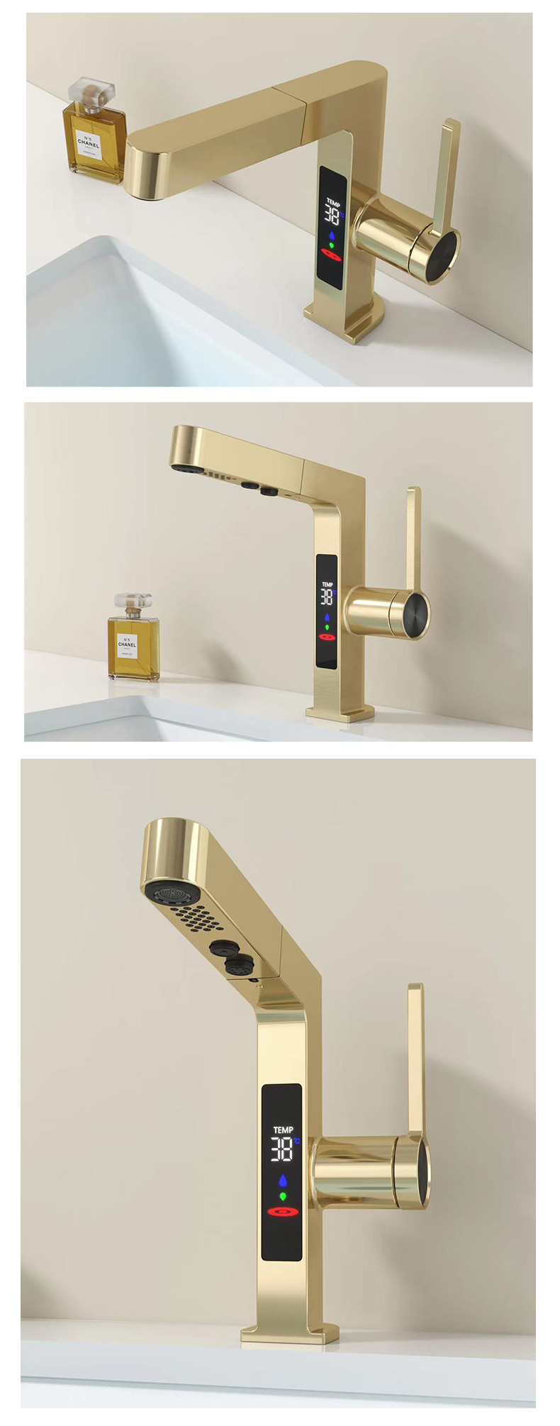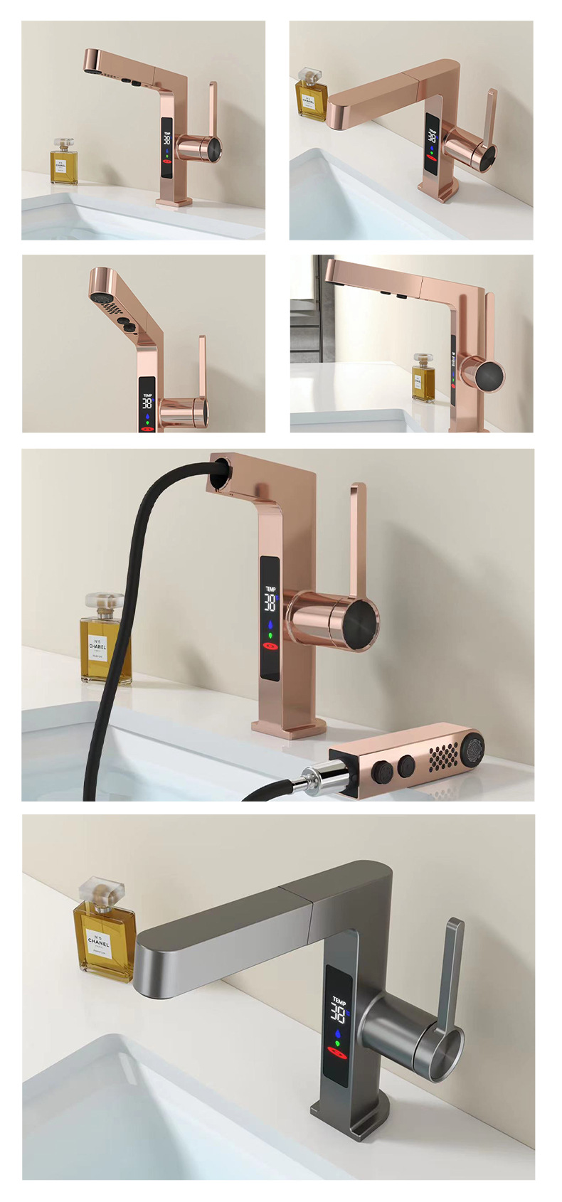 スマートな新型引き出し式蛇口、デジタルディスプレイ付き、ダブルヘッド吐水、亜鉛メッキ銅製、セラミックコア、メーカー在庫卸売