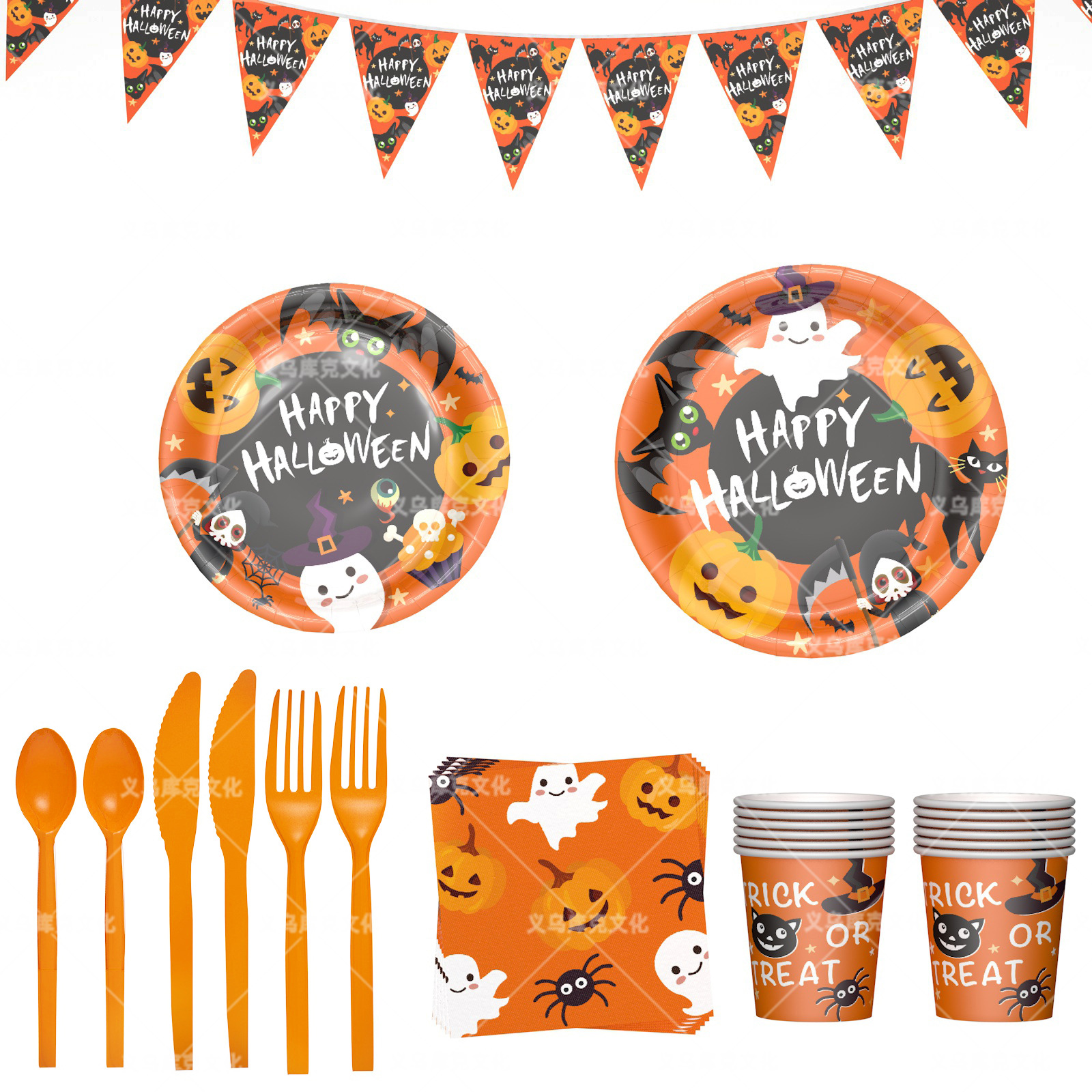 アマゾンの新しいハロウィーンパーティーのテーマ使い捨て紙皿紙コップの旗を引っ張るhappyhalloweenセット