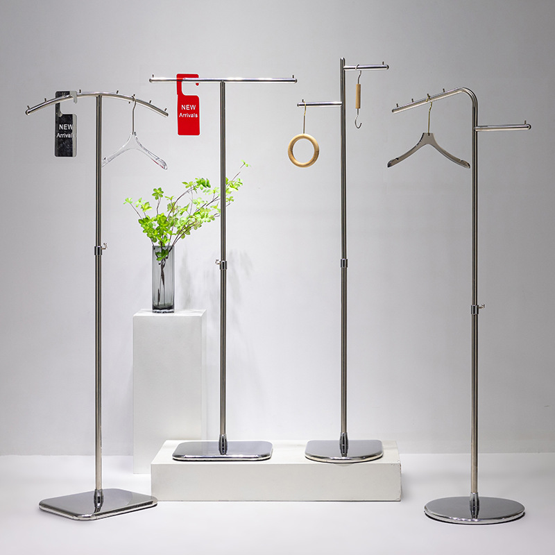 衣料品店用ステンレス製男女兼用店舗中島什器、自立型ハンガーラック、衣類・帽子陳列ディスプレイスタンド