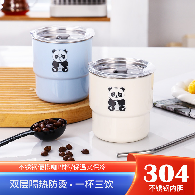 かわいい漫画 304 ステンレス鋼の蓋付きウォーターカップ、火傷防止コーヒーカップ、屋外キャンプティーカップ、冷たい飲み物ビール