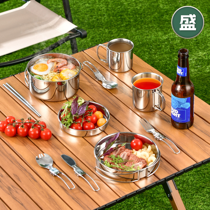 クロスボーダー屋外304ステンレス鋼カップ山登りポータブル6点セット鍋キャンプピクニックバーベキュー旅行釣り食器