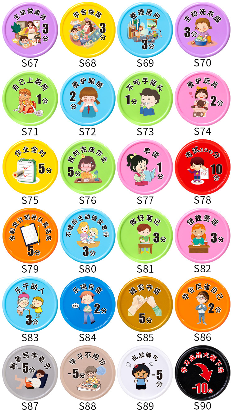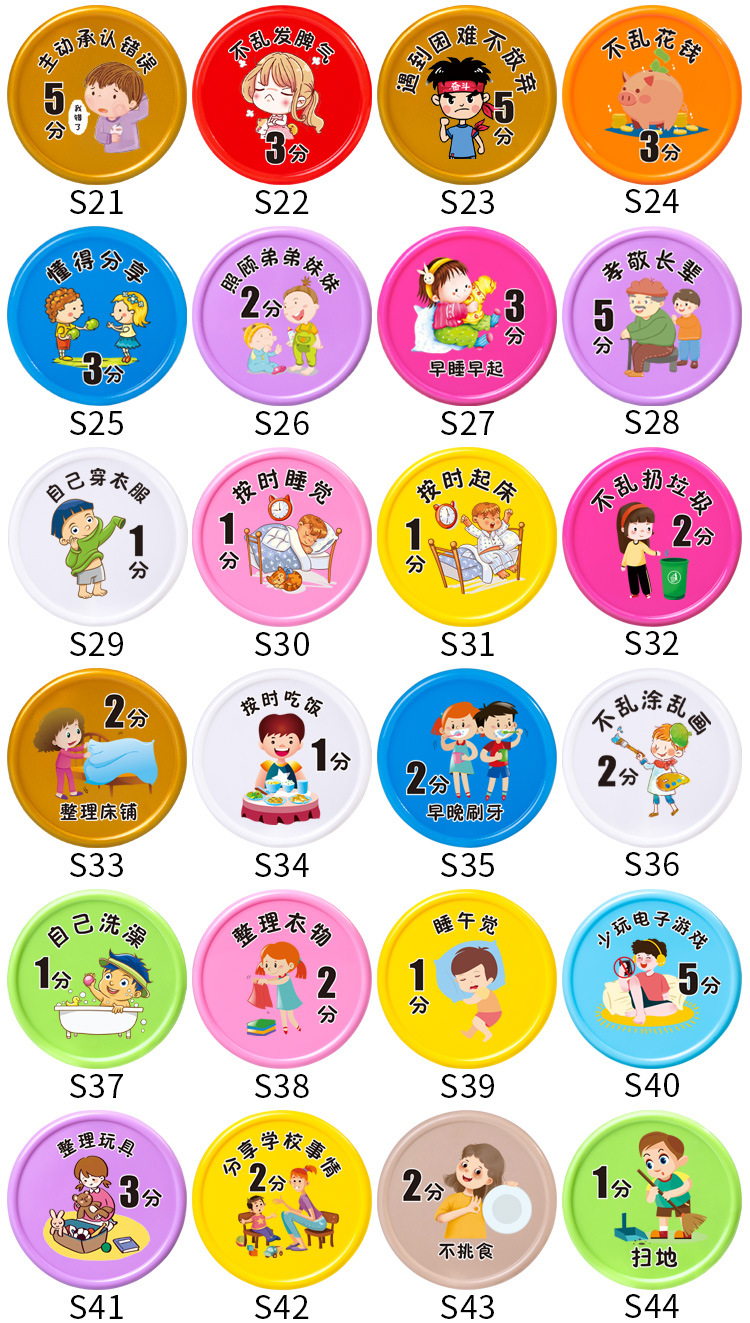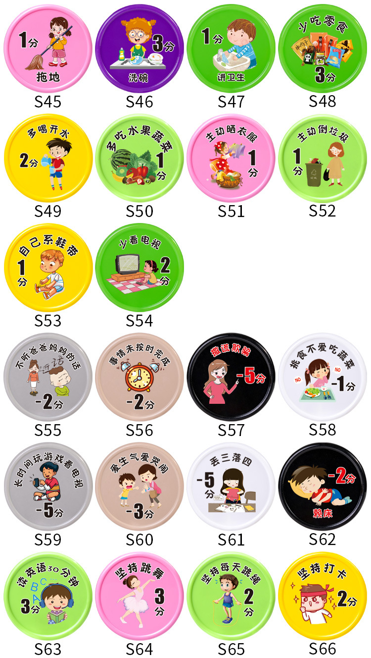 こまめに作業を済ませて5分10枚袋入り,読み続けて4分10枚袋に入れる,真剣に古詩の詞を暗記して3分10枚の袋に入れます。,練習字を堅持して2分10枚の袋に入れます。,先生に褒められて3分10枚/袋入り,仕事は真剣に2分10枚の袋に分けた,試験は良い成績を得て10点10錠袋に入れた,体を鍛え続ける2分10枚/袋入り,試験の進歩5分10錠の袋入り,授業の復習をしっかりと行います。,毎日10個の単語を3分10枚/袋に入れる,机の本棚を整理する2分10枚/袋入り,自主的に授業の予習をします。,整理カバン2点10枚/袋入り,数学の問題を作る2分10枚/袋入り,ピアノの練習を続けて3分10枚の袋に入れます。,時間通りに学校に通って2分10枚袋入り,賞状メダルトロフィー10点獲得,文章を書くことを堅持して3分10枚の袋に入れる,自分から声をかけて1分10枚/袋入り,自主的に間違いを認めて5分10枚/袋入り,むやみに怒らない3分10枚袋入り,困ったときはあきらめず5分10枚入,むやみにお金を使わない3分10枚/袋入り,分けて3分10枚の袋を分けます。,弟の妹の世話をする2分10枚/袋入り,早寝早起き3分10枚/袋入り,目上の人に孝行して5分10枚の袋に入れます。,自分で服を着て1分10枚/袋入り,時間どおりに寝る1分10枚/袋入り,時間どおりに起きて1分10枚袋入り,ごみをむやみに捨てない2分10枚袋入り,整理ベッド2点10枚/袋入り,時間どおりに食事をして1分10枚袋入り,朝晩歯磨き2分10枚入,落书きなし2分10枚/袋入り,自分でお風呂に入り1分10枚袋入り,衣類整理2点10枚入,お昼寝1分10枚入,ゲームをしないで5分10枚の袋に入れます。,整理おもちゃ3分10枚入,学校のことを2分10枚袋に分けて共有する,好き嫌いなし2分10枚袋入り,床を掃く1分10枚袋入り,モップ1点10枚袋入り,皿洗い3分10枚袋入り,衛生について1分10枚の袋入り,スナックを食べないで3分10枚の袋に入れます。,お湯を多く飲んで2分10錠袋に入れます。,果物野菜をたくさん食べて1分10枚袋入り,自発的に服を干して1分10枚の袋に入れます。,自発的にゴミを捨てる,自分で靴ひもを結び1分10枚袋入り,テレビを見ないで2分10枚袋入り,両親の話を聞かないで2分10枚の袋を減らします。,時間どおりに2点10枚の袋を減らすことができなかった,嘘をついて5点10枚の袋をだます,好き嫌いは野菜を食べないで1分10枚の袋を減らします。,長い間ゲームをしてテレビを見て5分10枚の袋を減らします。,愛は怒って泣いて3分10枚の袋を減らします。,三落四マイナス5点10枚袋入り,ベッドから2分10枚の袋を減らします。