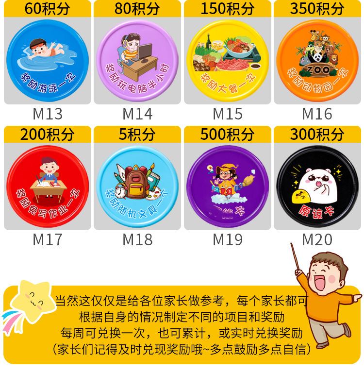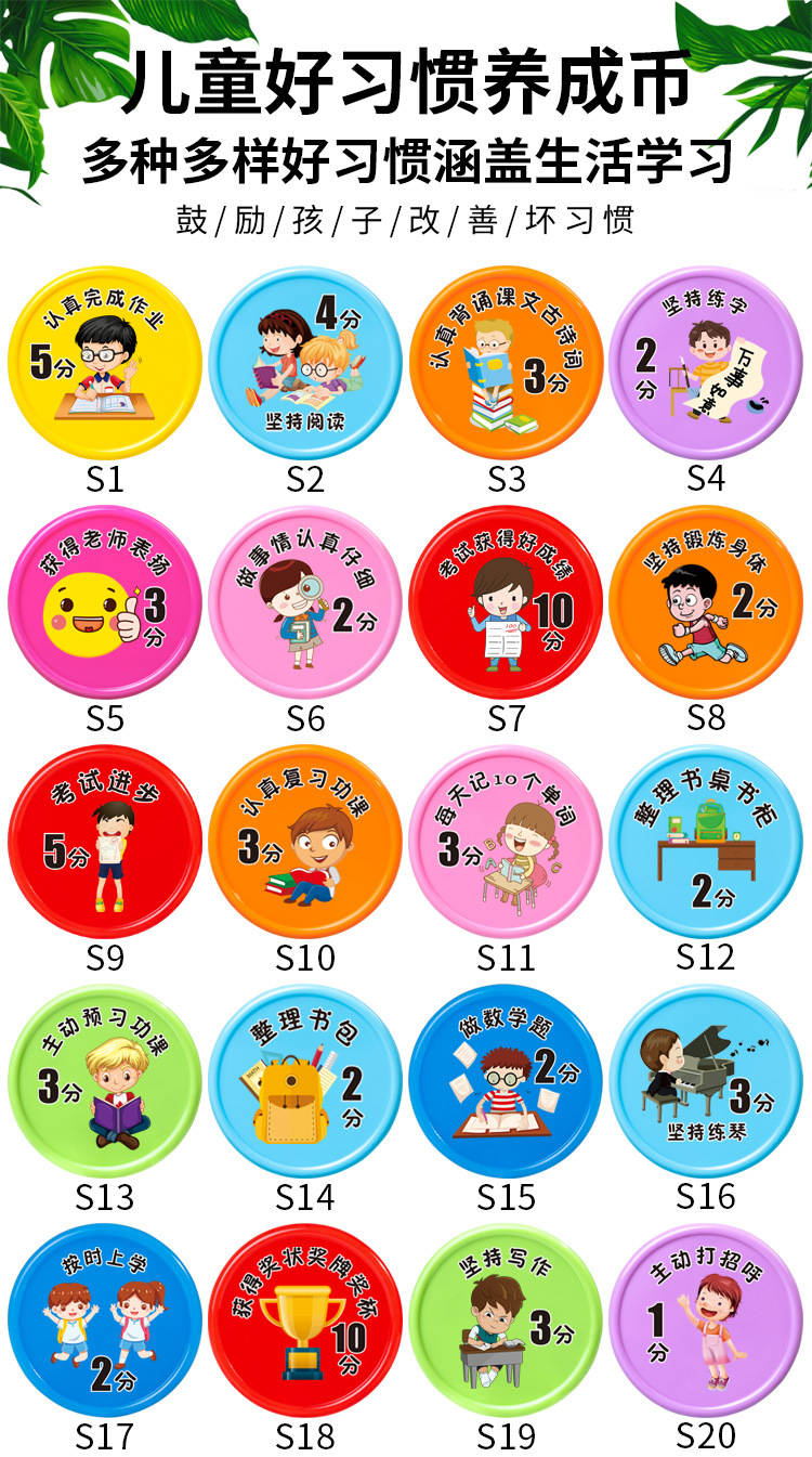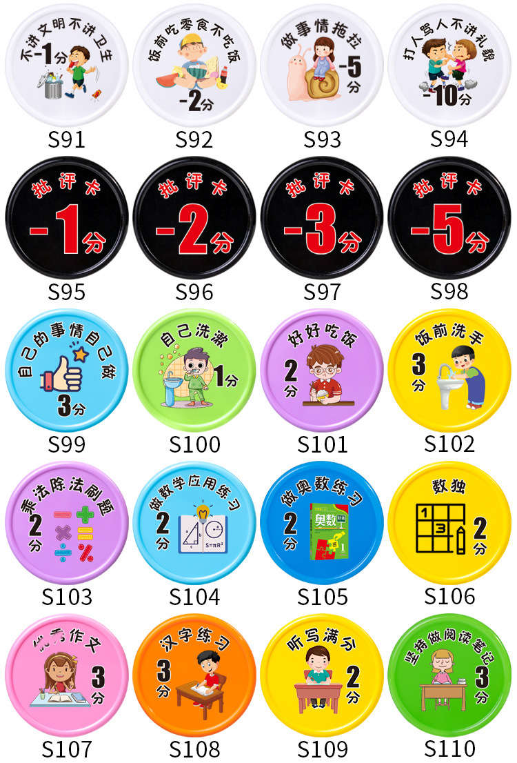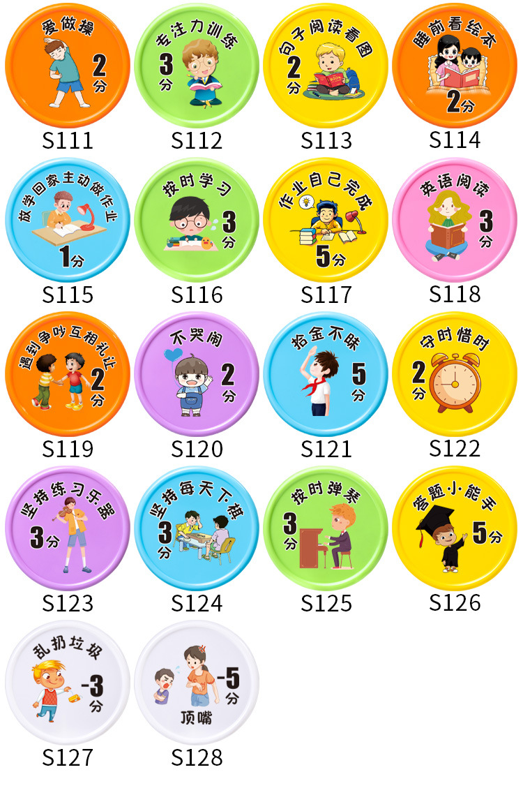 こまめに作業を済ませて5分10枚袋入り,読み続けて4分10枚袋に入れる,真剣に古詩の詞を暗記して3分10枚の袋に入れます。,練習字を堅持して2分10枚の袋に入れます。,先生に褒められて3分10枚/袋入り,仕事は真剣に2分10枚の袋に分けた,試験は良い成績を得て10点10錠袋に入れた,体を鍛え続ける2分10枚/袋入り,試験の進歩5分10錠の袋入り,授業の復習をしっかりと行います。,毎日10個の単語を3分10枚/袋に入れる,机の本棚を整理する2分10枚/袋入り,自主的に授業の予習をします。,整理カバン2点10枚/袋入り,数学の問題を作る2分10枚/袋入り,ピアノの練習を続けて3分10枚の袋に入れます。,時間通りに学校に通って2分10枚袋入り,賞状メダルトロフィー10点獲得,文章を書くことを堅持して3分10枚の袋に入れる,自分から声をかけて1分10枚/袋入り,自主的に間違いを認めて5分10枚/袋入り,むやみに怒らない3分10枚袋入り,困ったときはあきらめず5分10枚入,むやみにお金を使わない3分10枚/袋入り,分けて3分10枚の袋を分けます。,弟の妹の世話をする2分10枚/袋入り,早寝早起き3分10枚/袋入り,目上の人に孝行して5分10枚の袋に入れます。,自分で服を着て1分10枚/袋入り,時間どおりに寝る1分10枚/袋入り,時間どおりに起きて1分10枚袋入り,ごみをむやみに捨てない2分10枚袋入り,整理ベッド2点10枚/袋入り,時間どおりに食事をして1分10枚袋入り,朝晩歯磨き2分10枚入,落书きなし2分10枚/袋入り,自分でお風呂に入り1分10枚袋入り,衣類整理2点10枚入,お昼寝1分10枚入,ゲームをしないで5分10枚の袋に入れます。,整理おもちゃ3分10枚入,学校のことを2分10枚袋に分けて共有する,好き嫌いなし2分10枚袋入り,床を掃く1分10枚袋入り,モップ1点10枚袋入り,皿洗い3分10枚袋入り,衛生について1分10枚の袋入り,スナックを食べないで3分10枚の袋に入れます。,お湯を多く飲んで2分10錠袋に入れます。,果物野菜をたくさん食べて1分10枚袋入り,自発的に服を干して1分10枚の袋に入れます。,自発的にゴミを捨てる,自分で靴ひもを結び1分10枚袋入り,テレビを見ないで2分10枚袋入り,両親の話を聞かないで2分10枚の袋を減らします。,時間どおりに2点10枚の袋を減らすことができなかった,嘘をついて5点10枚の袋をだます,好き嫌いは野菜を食べないで1分10枚の袋を減らします。,長い間ゲームをしてテレビを見て5分10枚の袋を減らします。,愛は怒って泣いて3分10枚の袋を減らします。,三落四マイナス5点10枚袋入り,ベッドから2分10枚の袋を減らします。