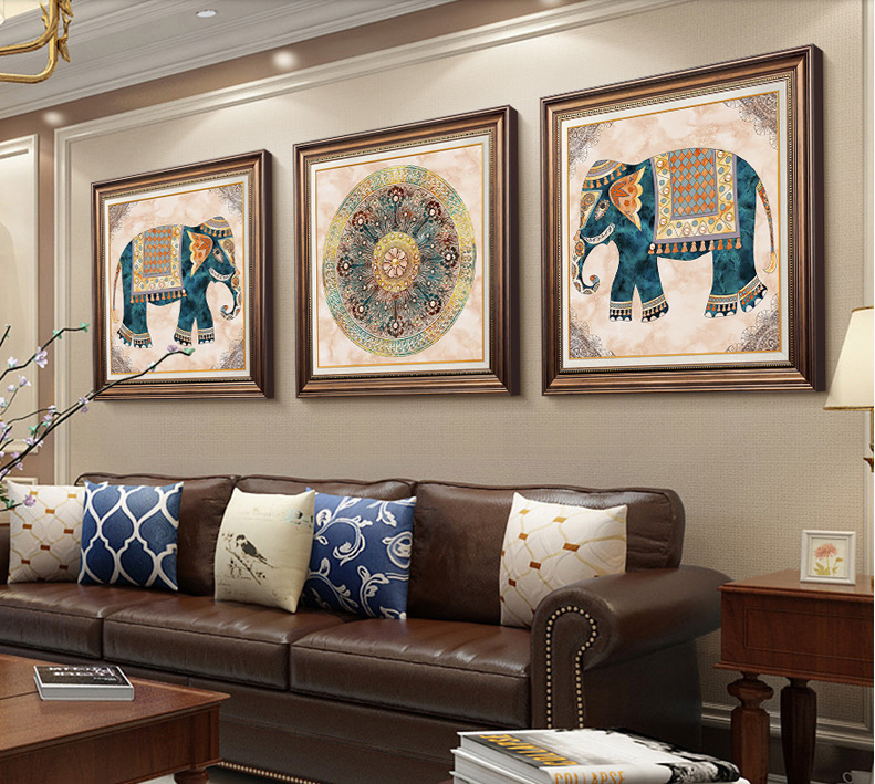 リビングルームの装飾画ソファーの背景の壁はヨーロッパ式の3連画を描いています。