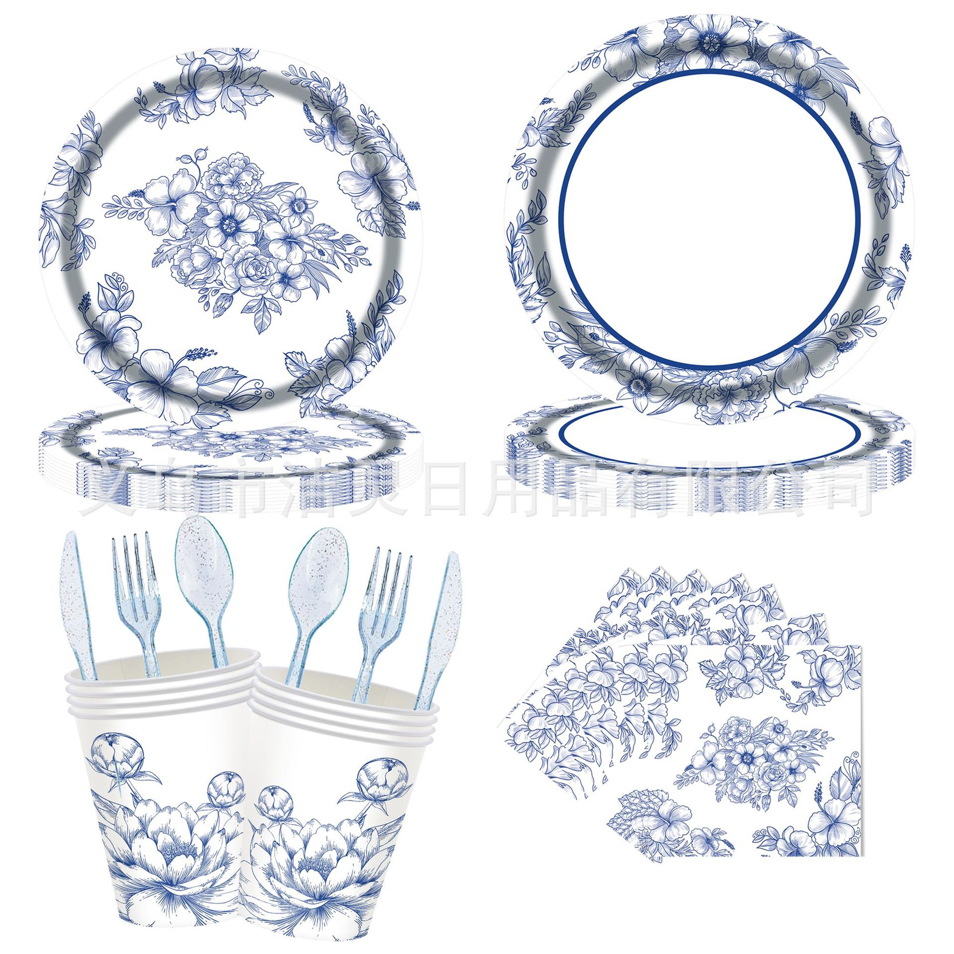 2023新しい青と花の磁器の誕生日のパーティーのテーマの食器のセットの使い捨ての紙の皿のティッシュの紙コップの装飾品