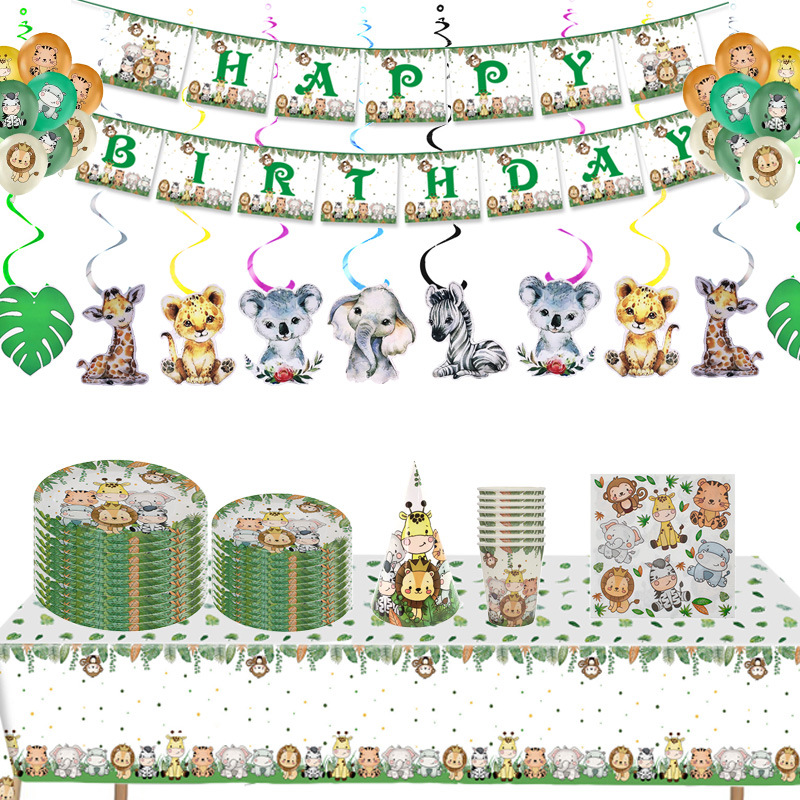 漫画の森動物園パーティー紙皿装飾用品子供の誕生日テーブルクロスバルーン吊り下げ装飾セット