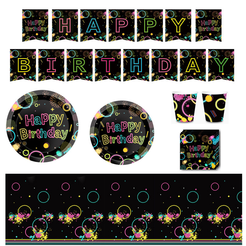 アマゾンの人気光るネオンのテーマの横断幕のテーブルクロスの子供の誕生日パーティー用品のセットの黒色のカラー