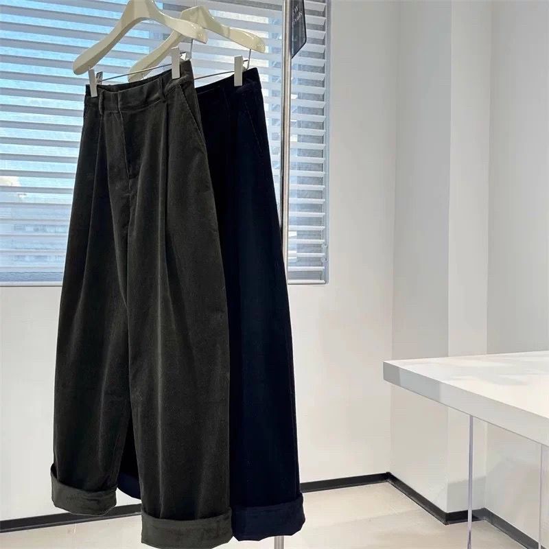 复古墨绿色灯芯绒阔腿裤子女早秋高腰气质通勤宽松直筒翻边休闲裤