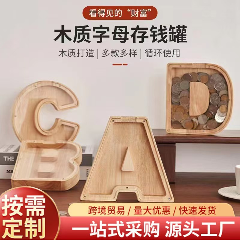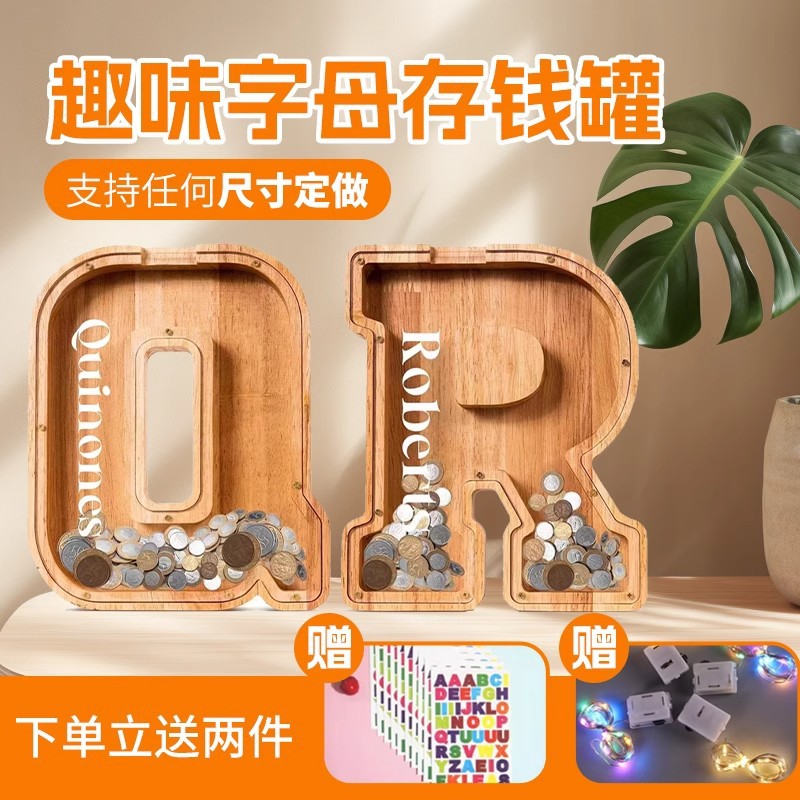 现货木制字母钱罐儿童储钱罐实木透明储蓄罐网红存钱箱硬币零钱罐