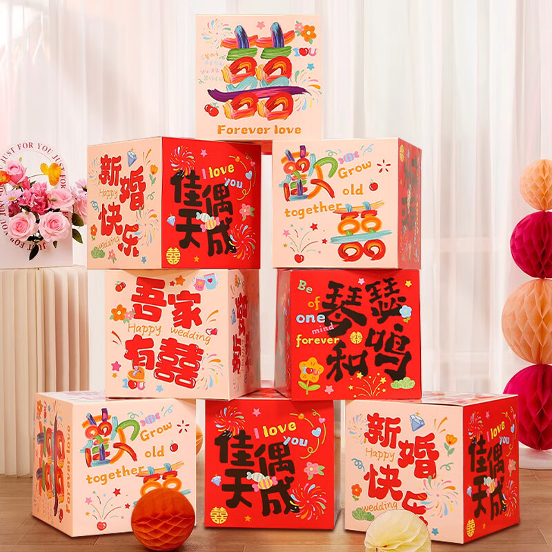 結婚部屋の配置は箱を積んで結婚して飾ります。