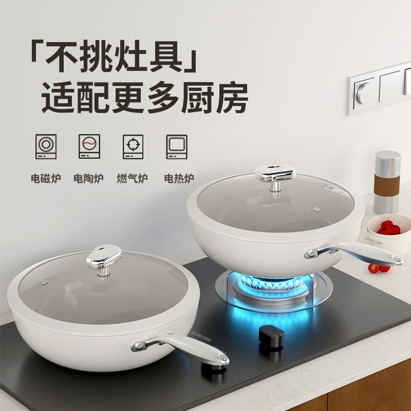 【关于产品】:(老款2023款28玻璃盖顶珠为方形、锅口无翻边设计;新款升级28、30玻璃盖顶珠为圆形,锅口翻边设计,有导流作用,汤汁不易挂壁)锅体为加厚铝合金基材,导热性约为铁和不锈钢的3倍,使用更加节能,中小火即可爆炒。食品级麦饭石颗粒融合不粘工艺,健康少油,不粘不糊清洗方便;导磁不锈钢复底,不挑灶具、电磁炉电陶炉明火燃气通用。