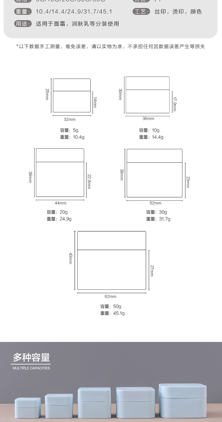 四方圆边磨砂面膏霜罐面膜面霜眼霜卸妆膏分装空瓶5g10g20g30g50g