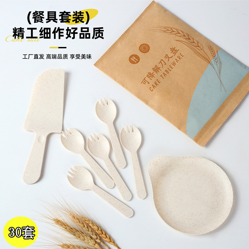 30套可降解一次性小麦秸秆刀叉盘套装水滴盘蛋糕盘叉组三合一套装