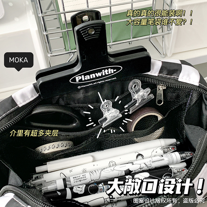 新品インスタ风定番牛乳柄白黒碁盘格ペンケース大容量学生収纳袋格子铅笔ケース