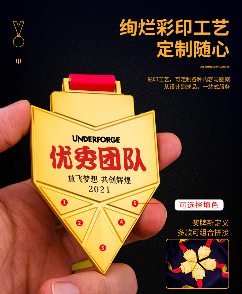 カスタムメイドのメダル、組み合わせデザイン、クリエイティブなチーム賞、運動会、マラソン、ランニング、4in1金メッキメダル