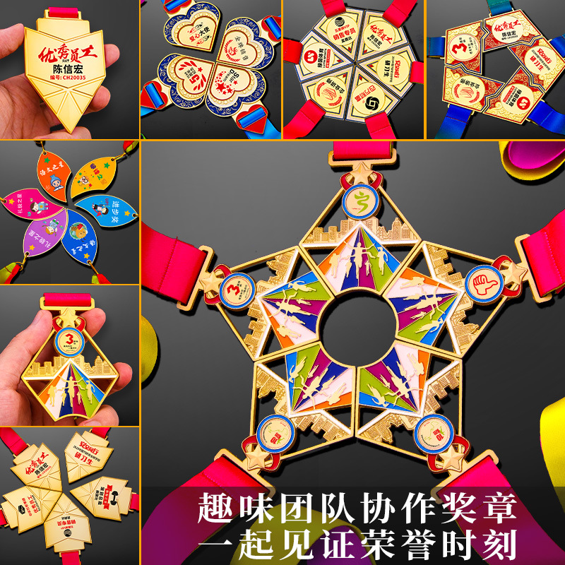 チームは組み合わせのメダルをつなぎ合わせて新年会の優秀なグループ活動のアイデアをカスタマイズします。