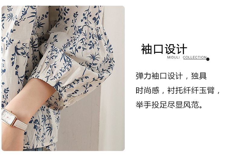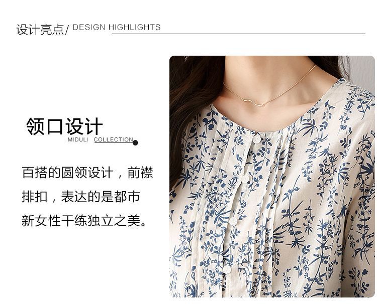 メーカー直売の青い花の純綿のシャツの女性の7分袖の夏服の新型の花の独特な年齢の小さいシャツの上着を減らします。