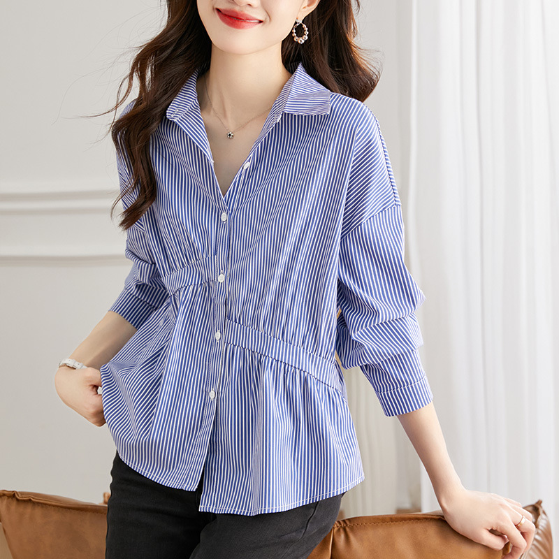 メーカー直販非対称しわブルーストライプシャツ女性長袖秋デザイン感小衆上着純綿白シャツ