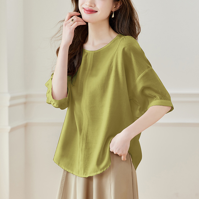 メーカー直売のデザイン感は白いシャツの女性五分袖の夏服の新型純綿の上着の丸首のゆったりしたシャツをつなぎ合わせます。