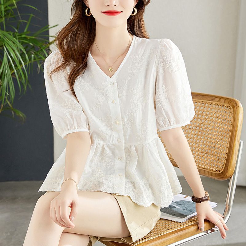 メーカー直販レースvネックシャツ女性夏新作フランスシックゆったり上着純綿白シャツ