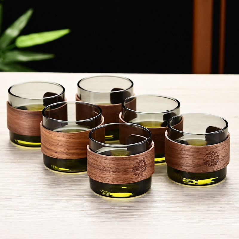 胡桃材の中国風ガラス茶杯、個人用マスターカップ、耐熱ガラスカップ、お茶鑑賞用カップ、火傷防止茶杯