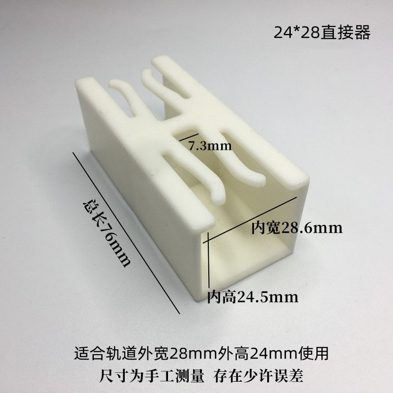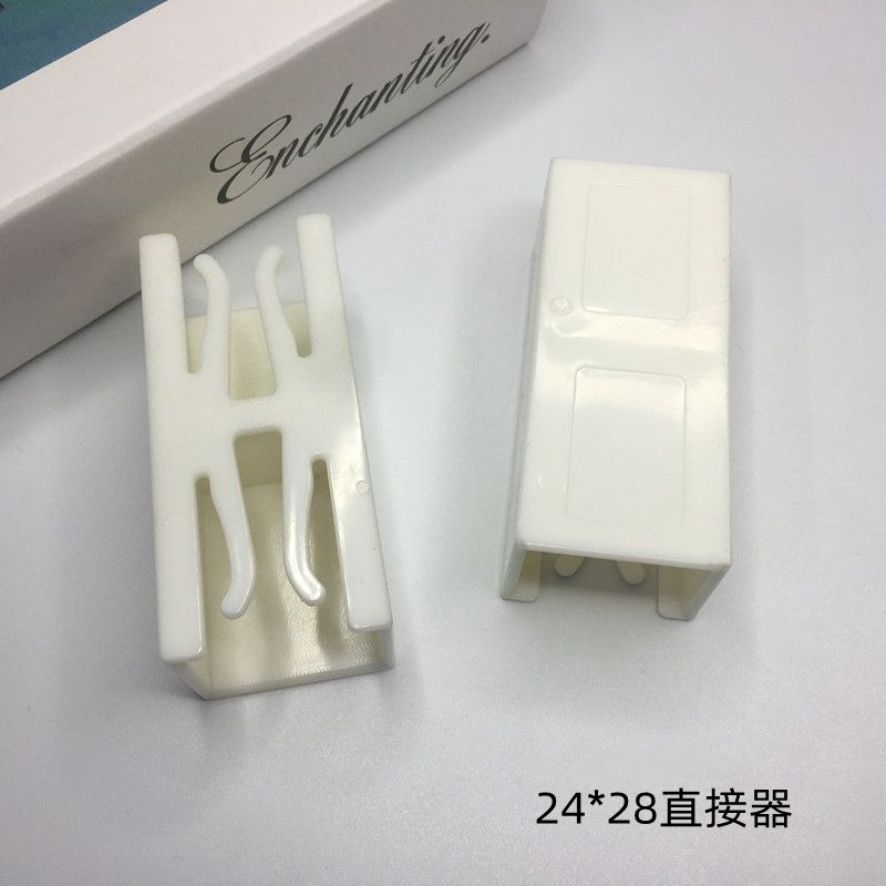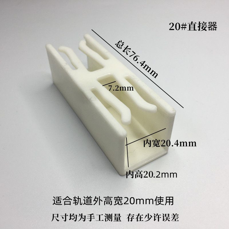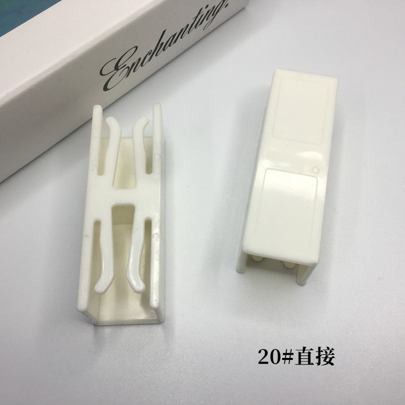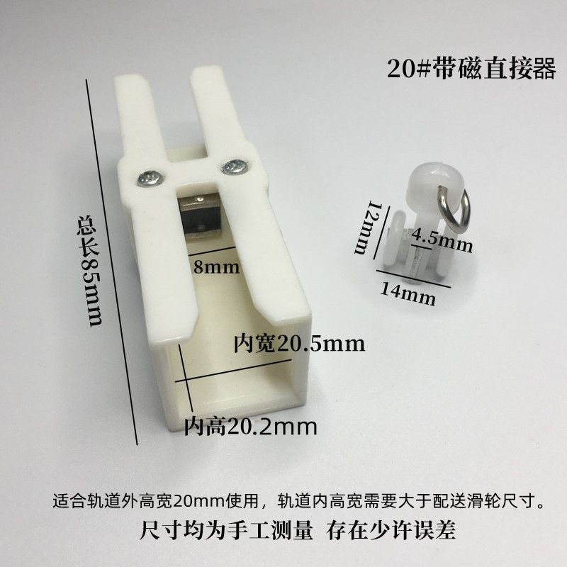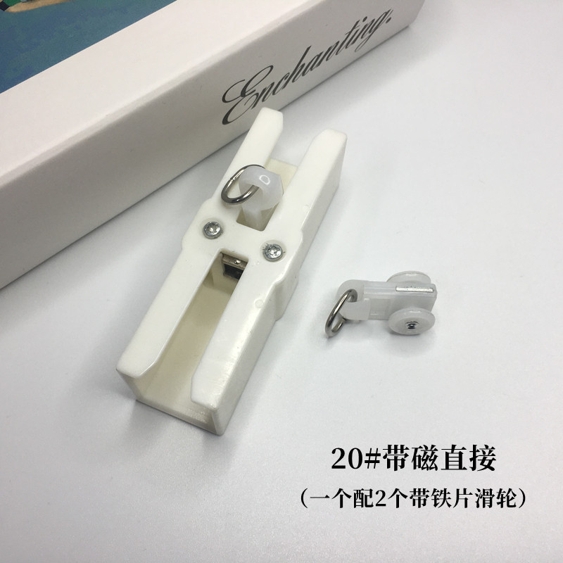 本产品是窗帘轨道连接器,可防止窗帘闭合漏光。共三种尺寸:20#带磁直接器,20#直接器,24*28直接器。其中20#带磁直接一个配有2个带铁片滑轮。不明处可咨询联系客服——环城五金塑料制品厂