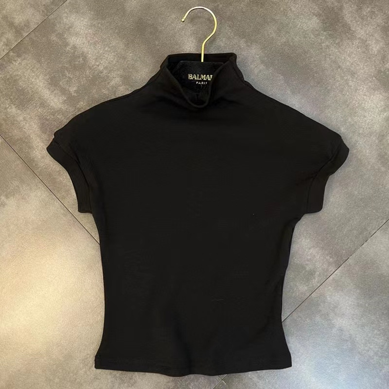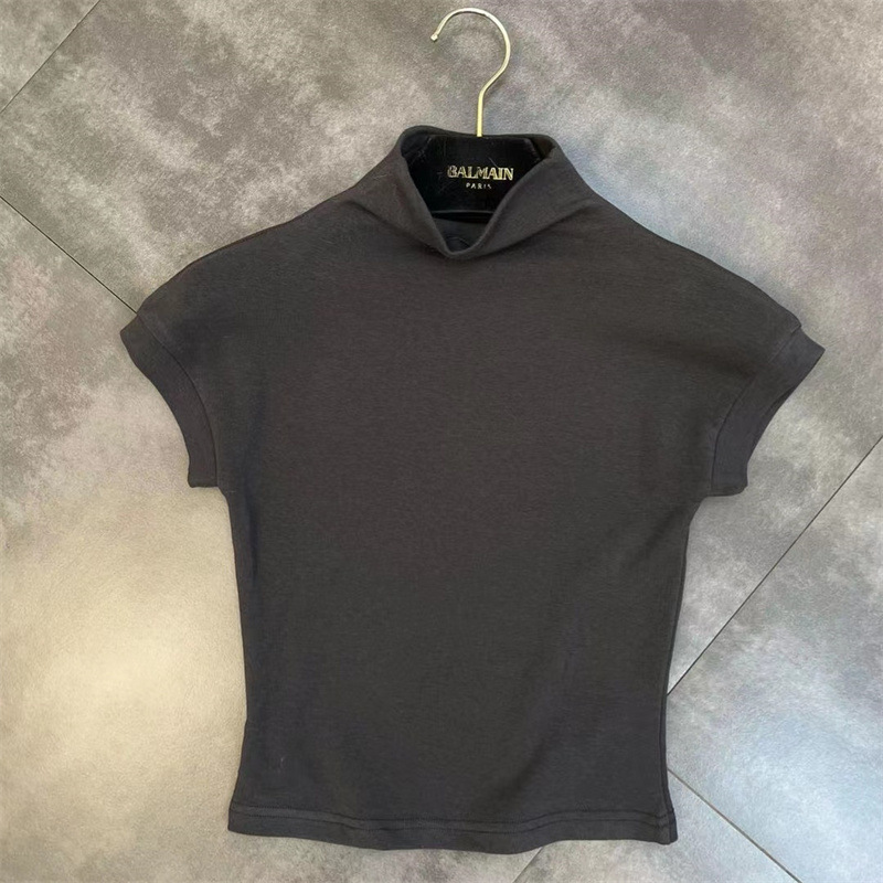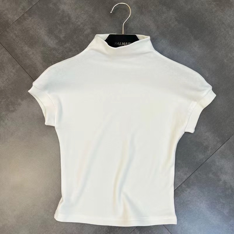 女の子の夏の新作、ハーフタートルネック半袖ストレッチタイトTシャツ、韓国風万能無地子供服、インスタ映えTシャツ