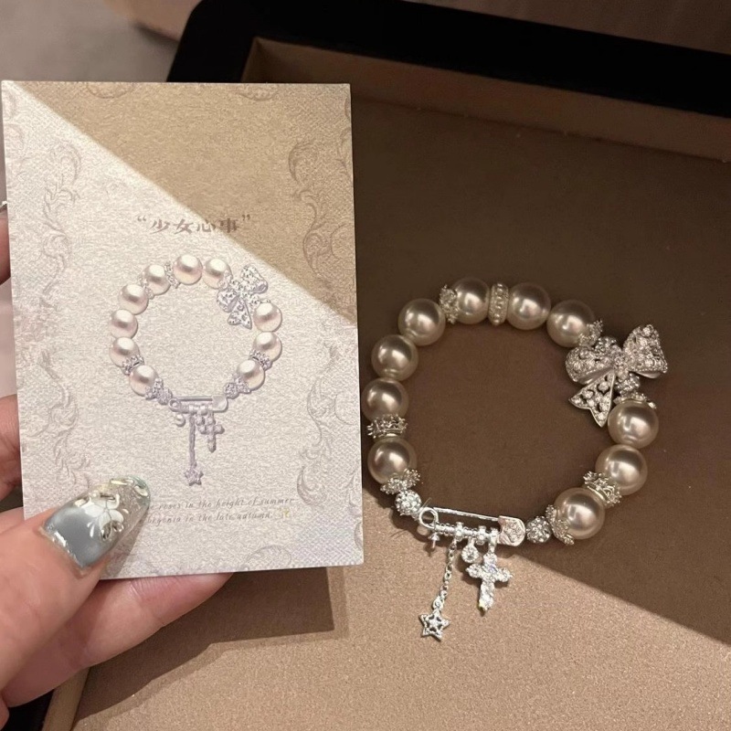 高级蕾丝蝴蝶结手链小众轻奢满钻别针扣十字架手串流星仿珍珠手串