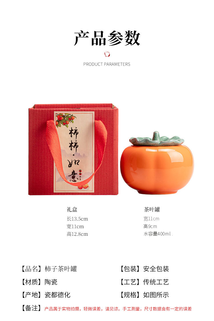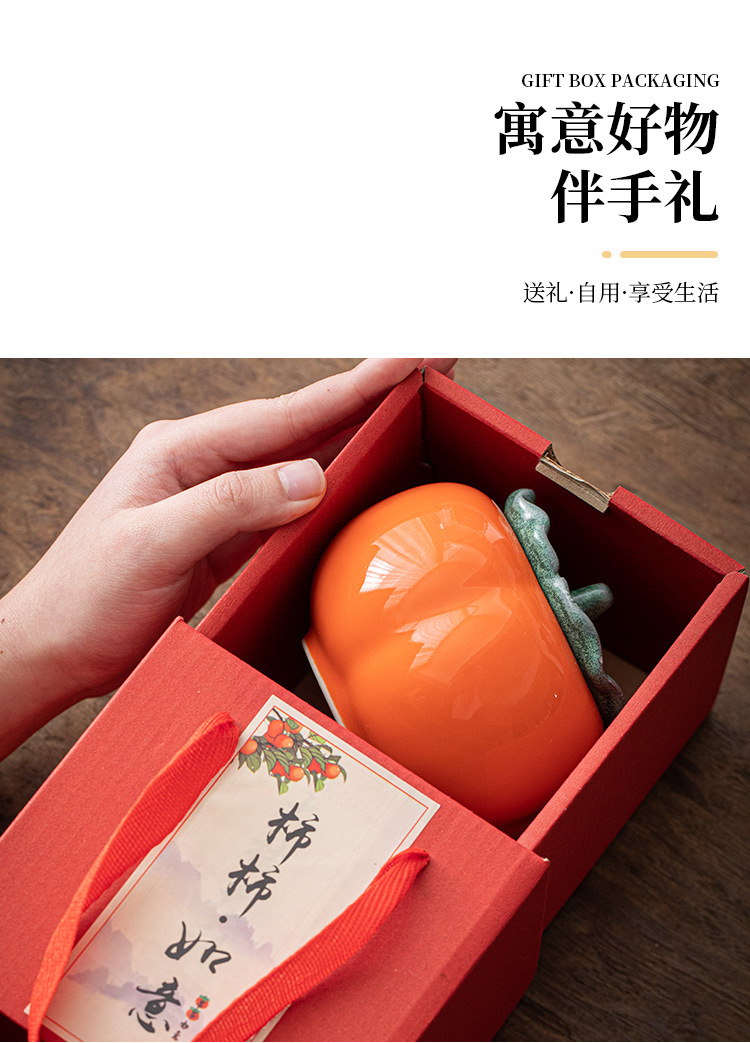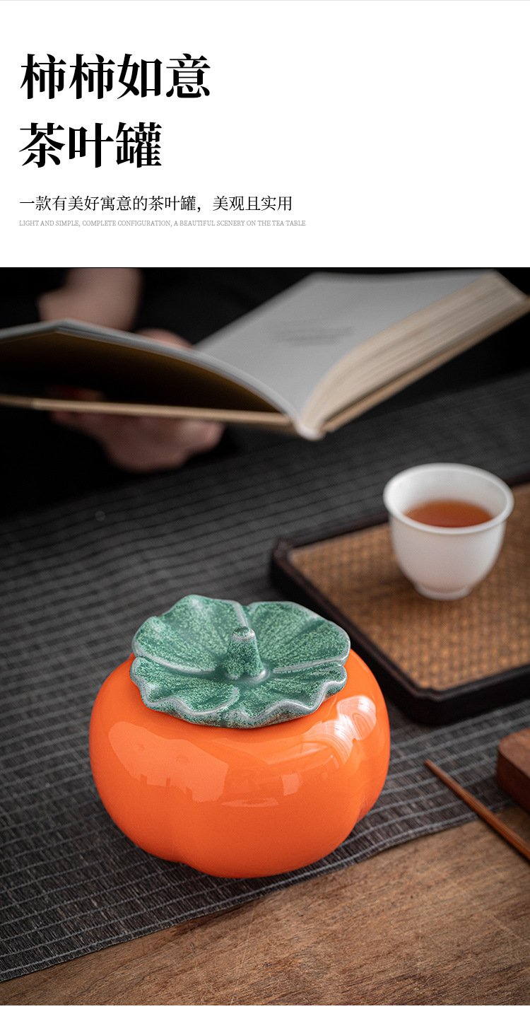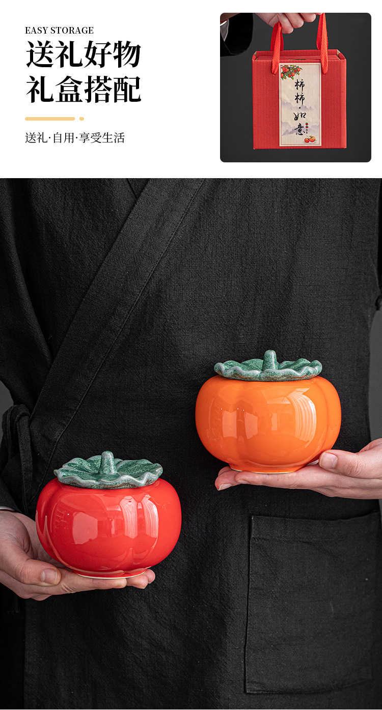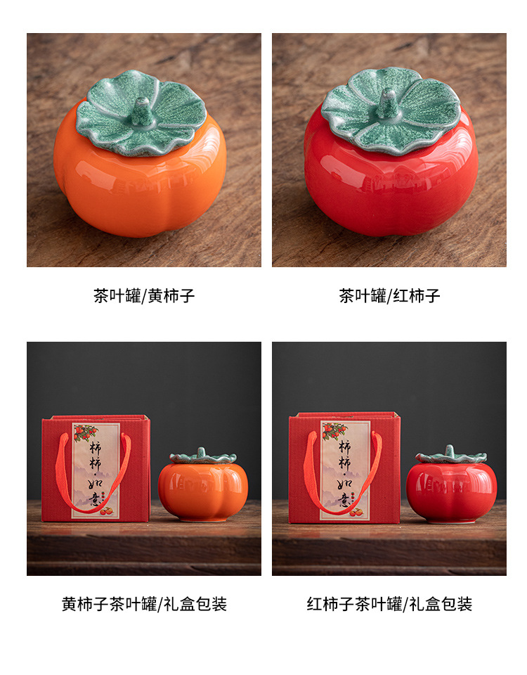 柿柿如意陶瓷茶叶罐大中小号树脂盖子绿叶柿子密封罐好柿成双礼盒