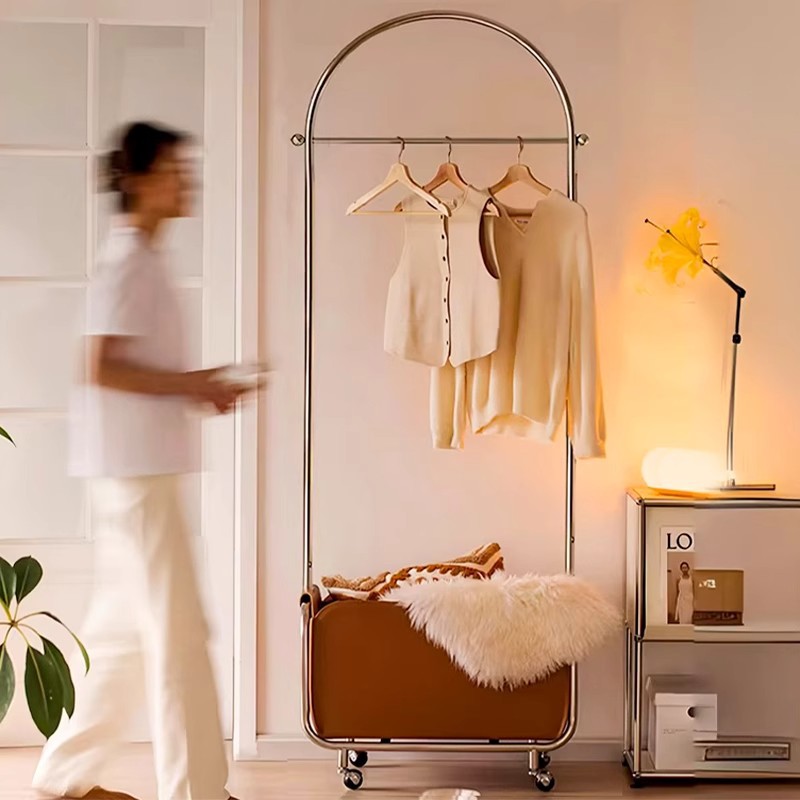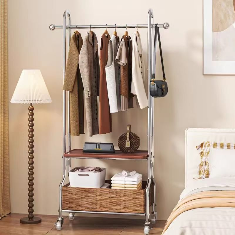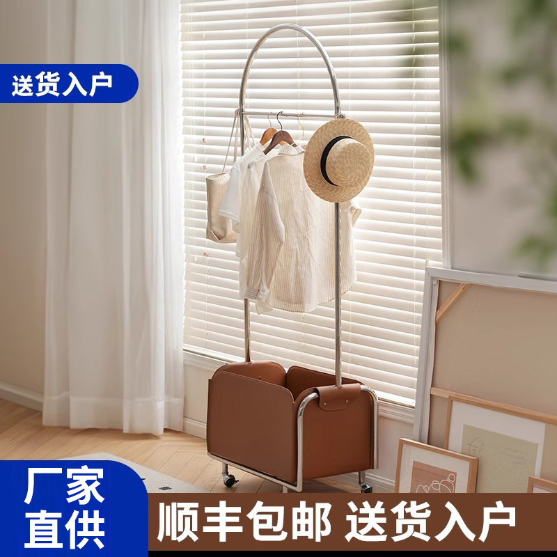 不锈钢挂衣架中古风衣帽架隔夜衣收纳架带轮皮革玄关卧室床边家用