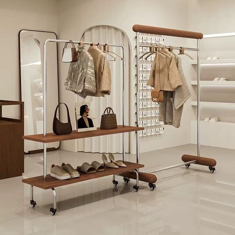 服装店胡桃木色落地挂衣架不锈钢中古风展示架女装店铺可移动货架