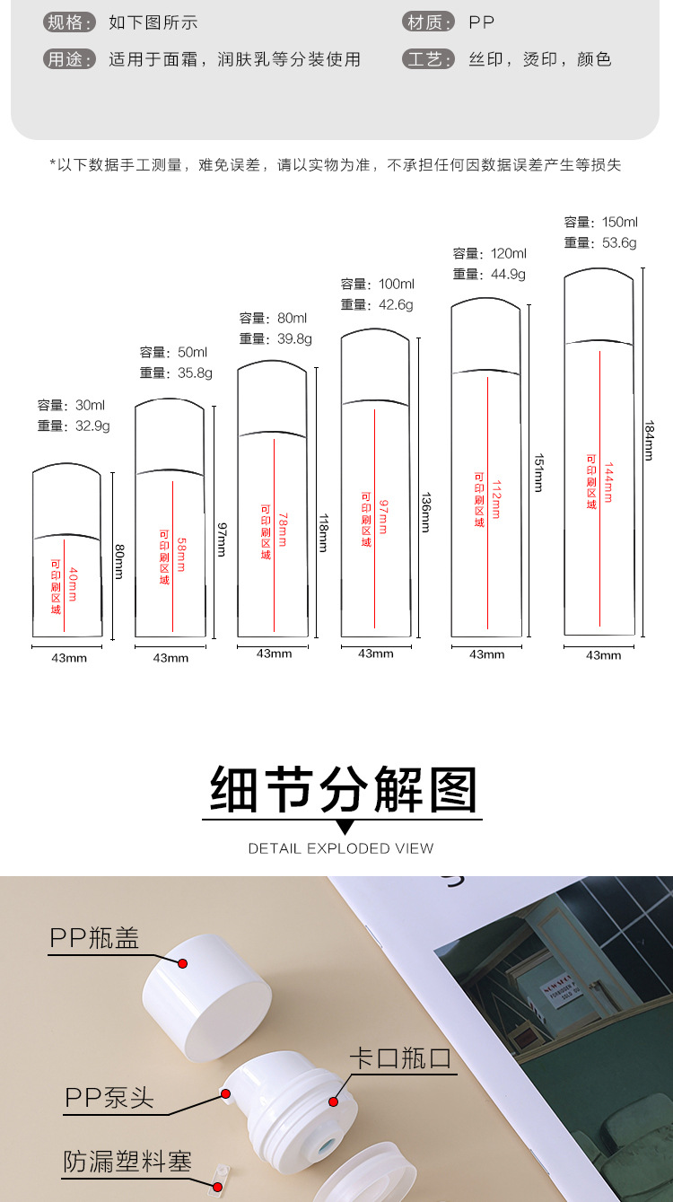 真空卡扣乳液瓶30ml50ML100ML150ML按压式洗面奶瓶面霜瓶润肤乳瓶