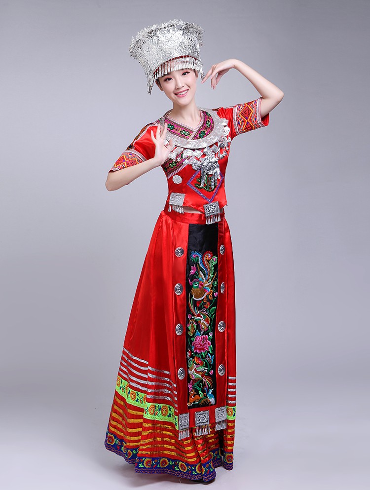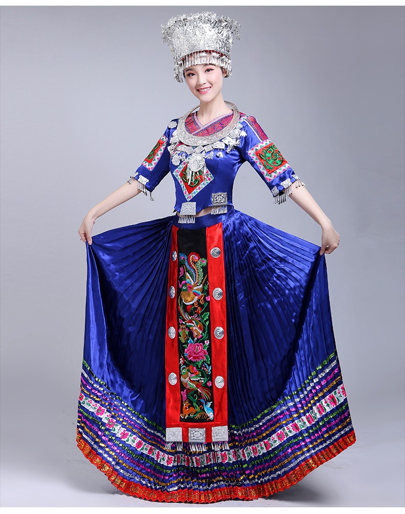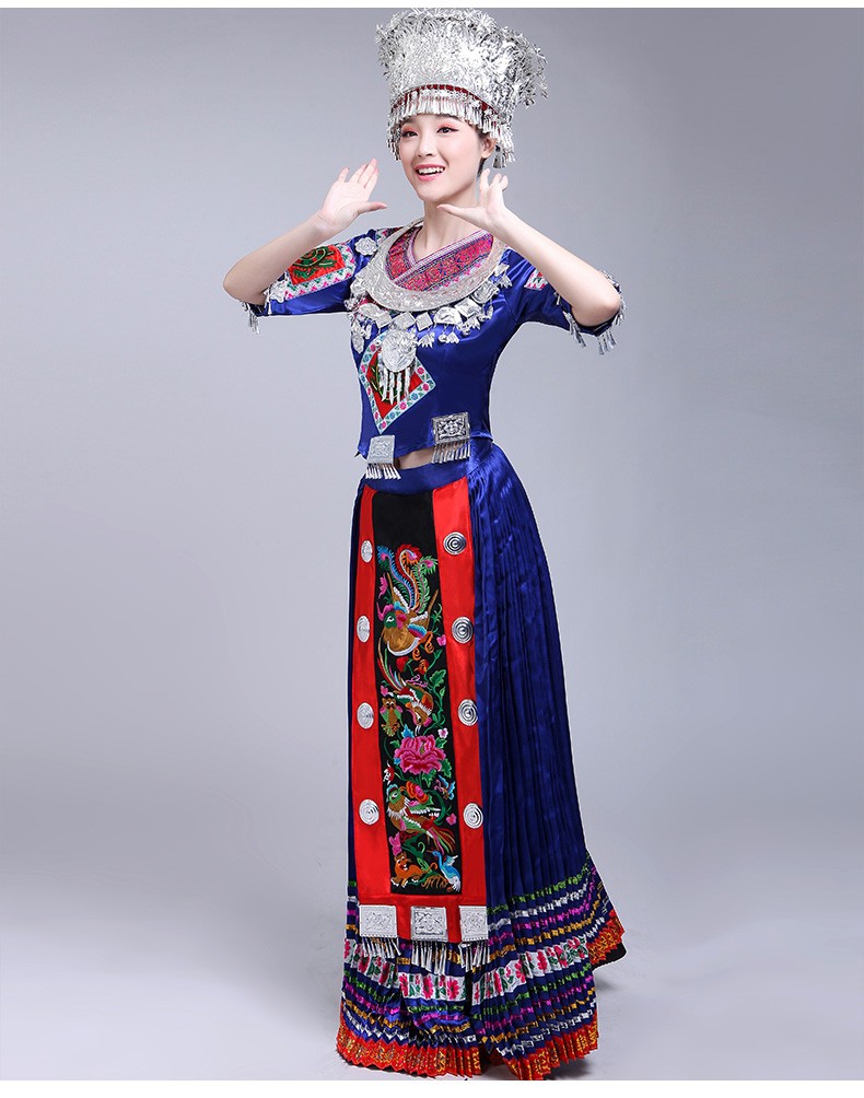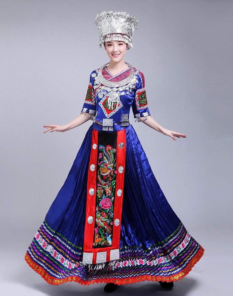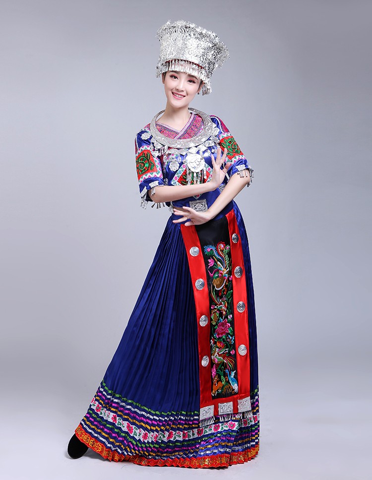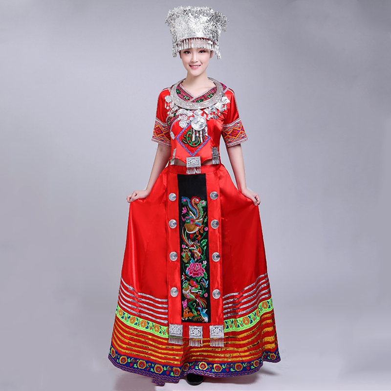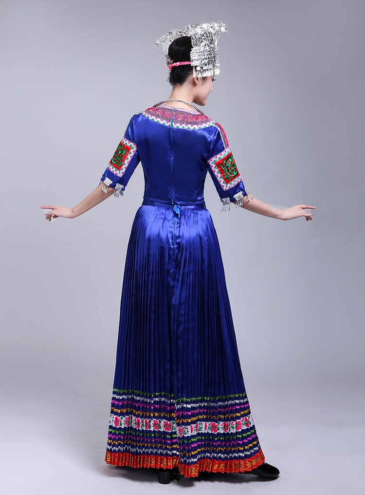 新商品のミャオ族の服装の女性のミャオ疆の少女のミャオ家は刺繍の舞台の出演服を飾って独唱して試合の旅を撮影します。