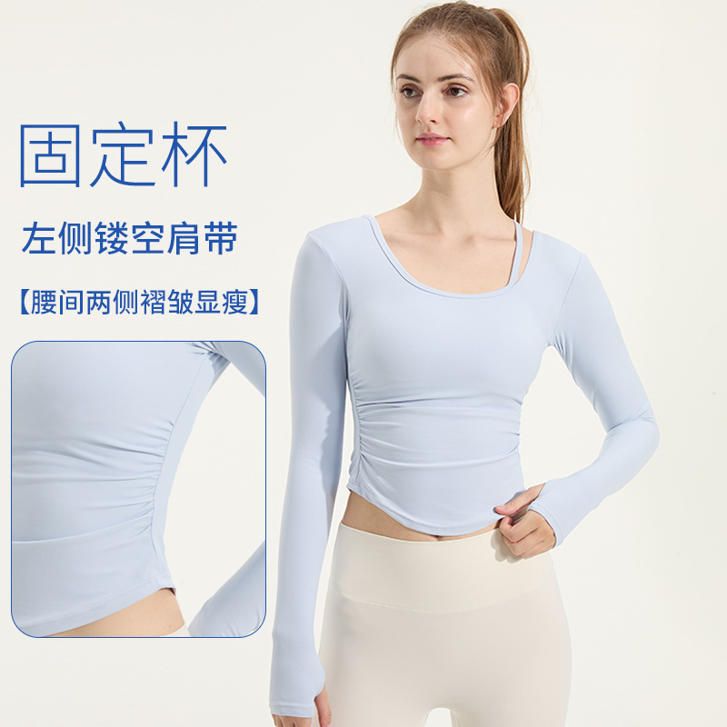 新款斜肩镂空运动上衣女侧边抽褶修身显瘦长袖带胸垫健身瑜伽服秋