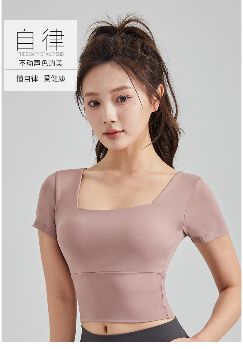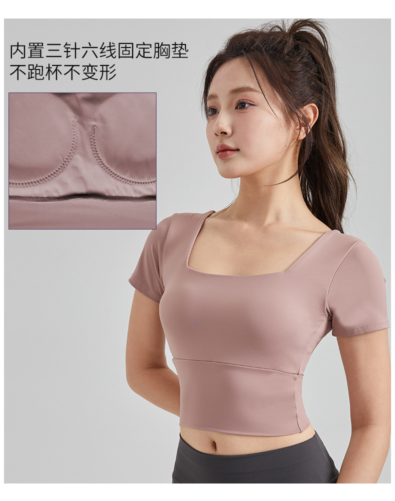 新しいlulu方襟ヨガ半袖運動ガードル速乾フィットネス上着胸パッド付きヨガ服女性夏